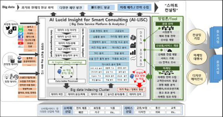 - 다양한 정보원으로부터 방대한 데이터를 수집한 후, Big Data, NLP/AI 기술을 활용한 서비스 (소설 트렌드 분석, TPO 분석 등)와 데이터 기반 스마트 컨설팅 방법론/Tool을 결합하여 컨설팅업체, 마케팅/디자인 에이전시, 중소/중견 기업 대상으로 제공함으로써, 경영전략, 마케팅, 신상품 개발 등에서 구체적인 성과 창출을 지원하는 서비스 플랫폼(AI-LISC: AI 기반의 Lucid Insight for Smart Consulting)을 개발, 보급하는 것임